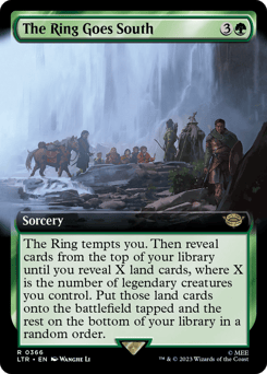 The Ring tempts you. Then reveal cards from the top of your library until you reveal X land cards, where X is the number of legendary creatures you control. Put those land cards onto the battlefield tapped and the rest on the bottom of your library in a random order.