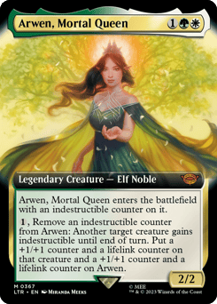 Arwen enters with an indestructible counter on it. {1}, Remove an indestructible counter from Arwen: Another target creature gains indestructible until end of turn. Put a +1/+1 counter and a lifelink counter on that creature and a +1/+1 counter and a lifelink counter on Arwen.