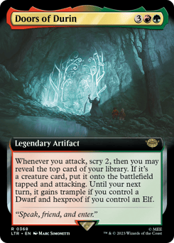 Whenever you attack, scry 2, then you may reveal the top card of your library. If it's a creature card, put it onto the battlefield tapped and attacking. Until your next turn, it gains trample if you control a Dwarf and hexproof if you control an Elf.