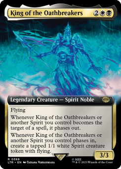 Flying Whenever King of the Oathbreakers or another Spirit you control becomes the target of a spell, it phases out. (Treat it and anything attached to it as though they don't exist until your next turn.) Whenever King of the Oathbreakers or another Spirit you control phases in, create a tapped 1/1 white Spirit creature token with flying.