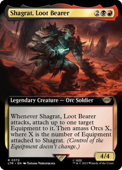 Whenever Shagrat attacks, attach up to one target Equipment to it. Then amass Orcs X, where X is the number of Equipment attached to Shagrat. (Control of the Equipment doesn't change. To amass Orcs X, put X +1/+1 counters on an Army you control. It's also an Orc. If you don't control an Army, create a 0/0 black Orc Army creature token first.)
