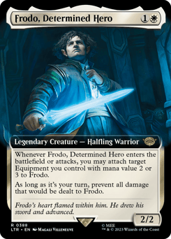 Whenever Frodo enters or attacks, you may attach target Equipment you control with mana value 2 or 3 to Frodo. During your turn, prevent all damage that would be dealt to Frodo.