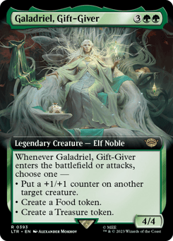 Whenever Galadriel enters or attacks, choose one — • Put a +1/+1 counter on another target creature. • Create a Food token. (It's an artifact with "{2}, {T}, Sacrifice this token: You gain 3 life.") • Create a Treasure token. (It's an artifact with "{T}, Sacrifice this token: Add one mana of any color.")