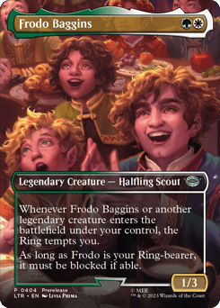 Whenever Frodo Baggins or another legendary creature you control enters, the Ring tempts you. As long as Frodo Baggins is your Ring-bearer, it must be blocked if able.