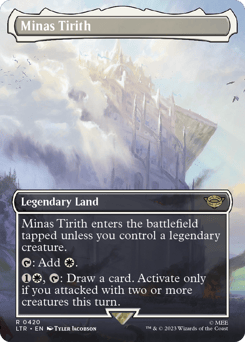 Minas Tirith enters tapped unless you control a legendary creature. {T}: Add {W}. {1}{W}, {T}: Draw a card. Activate only if you attacked with two or more creatures this turn.