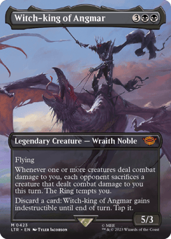 Flying Whenever one or more creatures deal combat damage to you, each opponent sacrifices a creature of their choice that dealt combat damage to you this turn. The Ring tempts you. Discard a card: Witch-king of Angmar gains indestructible until end of turn. Tap it.