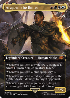 Whenever you cast a white spell, create a 1/1 white Human Soldier creature token. Whenever you cast a blue spell, scry 2. Whenever you cast a red spell, Aragorn deals 3 damage to target opponent. Whenever you cast a green spell, target creature gets +4/+4 until end of turn.