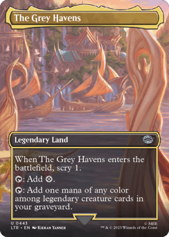 When The Grey Havens enters, scry 1. {T}: Add {C}. {T}: Add one mana of any color among legendary creature cards in your graveyard.