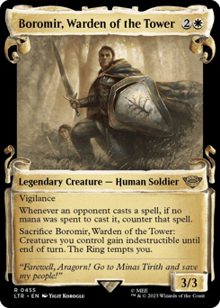 Vigilance Whenever an opponent casts a spell, if no mana was spent to cast it, counter that spell. Sacrifice Boromir: Creatures you control gain indestructible until end of turn. The Ring tempts you.
