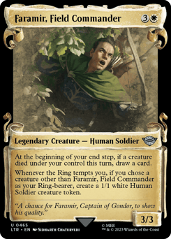 At the beginning of your end step, if a creature died under your control this turn, draw a card. Whenever the Ring tempts you, if you chose a creature other than Faramir as your Ring-bearer, create a 1/1 white Human Soldier creature token.