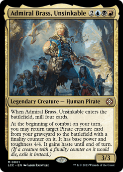 When Admiral Brass enters, mill four cards. At the beginning of combat on your turn, you may return target Pirate creature card from your graveyard to the battlefield with a finality counter on it. It has base power and toughness 4/4. It gains haste until end of turn. (If a creature with a finality counter on it would die, exile it instead.)