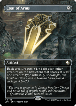 Each creature gets +1/+1 for each other creature on the battlefield that shares at least one creature type with it. (For example, if two Goblin Warriors and a Goblin Shaman are on the battlefield, each gets +2/+2.)
