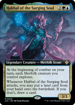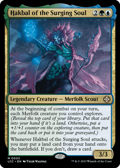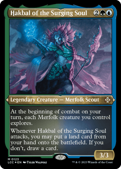 At the beginning of combat on your turn, each Merfolk creature you control explores. (Reveal the top card of your library. Put that card into your hand if it's a land. Otherwise, put a +1/+1 counter on the exploring creature, then put the card back or put it into your graveyard.) Whenever Hakbal attacks, you may put a land card from your hand onto the battlefield. If you don't, draw a card.
