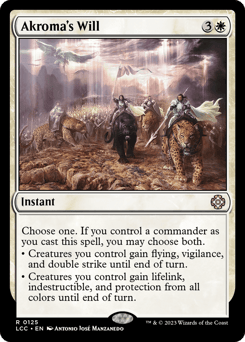 Choose one. If you control a commander as you cast this spell, you may choose both instead. • Creatures you control gain flying, vigilance, and double strike until end of turn. • Creatures you control gain lifelink, indestructible, and protection from each color until end of turn.