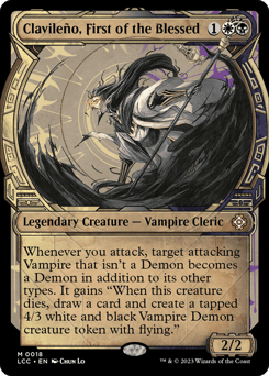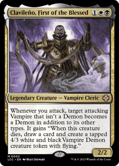 Whenever you attack, target attacking Vampire that isn't a Demon becomes a Demon in addition to its other types. It gains "When this creature dies, draw a card and create a tapped 4/3 white and black Vampire Demon creature token with flying."