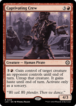 Each creature you control but don't own gets +2/+2, has menace and deathtouch, and is a Pirate in addition to its other types. Whenever you cast a noncreature spell you don't own, create two tapped Treasure tokens.