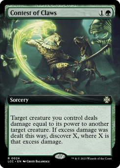 Target creature you control deals damage equal to its power to another target creature. If excess damage was dealt this way, discover X, where X is that excess damage. (Exile cards from the top of your library until you exile a nonland card with that mana value or less. Cast it without paying its mana cost or put it into your hand. Put the rest on the bottom in a random order.)