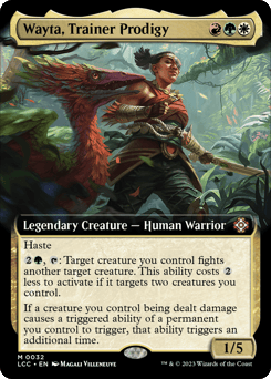 Haste {2}{G}, {T}: Target creature you control fights another target creature. This ability costs {2} less to activate if it targets two creatures you control. If a creature you control being dealt damage causes a triggered ability of a permanent you control to trigger, that ability triggers an additional time.