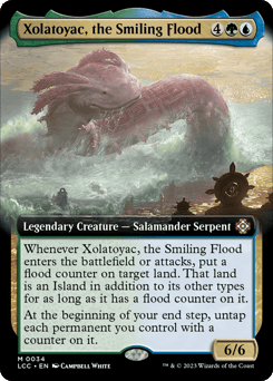 Whenever Xolatoyac enters or attacks, put a flood counter on target land. That land is an Island in addition to its other types for as long as it has a flood counter on it. At the beginning of your end step, untap each permanent you control with a counter on it.