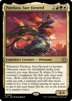 Whenever Pantlaza or another Dinosaur you control enters, you may discover X, where X is that creature's toughness. Do this only once each turn. (Exile cards from the top of your library until you exile a nonland card with that mana value or less. Cast it without paying its mana cost or put it into your hand. Put the rest on the bottom in a random order.)