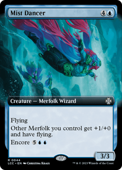 Flying Other Merfolk you control get +1/+0 and have flying. Encore {5}{U}{U} ({5}{U}{U}, Exile this card from your graveyard: For each opponent, create a token copy that attacks that opponent this turn if able. They gain haste. Sacrifice them at the beginning of the next end step. Activate only as a sorcery.)