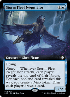 Flying Parley — Whenever this creature attacks, each player reveals the top card of their library. For each nonland card revealed this way, you create a Map token. Then each player draws a card. (A Map token is an artifact with "{1}, {T}, Sacrifice this token: Target creature you control explores. Activate only as a sorcery.")