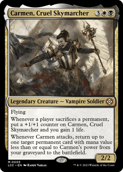 Flying Whenever a player sacrifices a permanent, put a +1/+1 counter on Carmen and you gain 1 life. Whenever Carmen attacks, return up to one target permanent card with mana value less than or equal to Carmen's power from your graveyard to the battlefield.