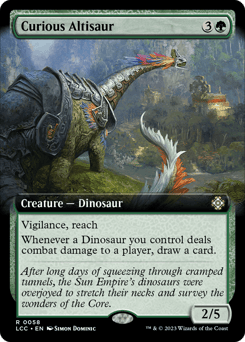 Vigilance, reach Whenever a Dinosaur you control deals combat damage to a player, draw a card.
