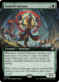 Whenever this creature attacks, you may have it become a copy of another target Dinosaur you control, except its name is Sunfrill Imitator and it has this ability.