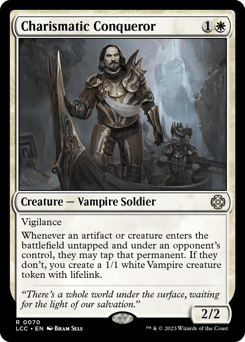Vigilance Whenever an artifact or creature an opponent controls enters untapped, they may tap that permanent. If they don't, you create a 1/1 white Vampire creature token with lifelink.