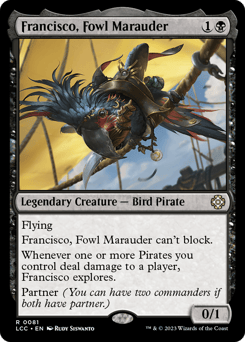 Flying Francisco can't block. Whenever one or more Pirates you control deal damage to a player, Francisco explores. Partner (You can have two commanders if both have partner.)