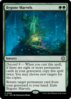 Descend 8 — When you cast this spell, if there are eight or more permanent cards in your graveyard, copy this spell twice. You may choose new targets for the copies. Return target permanent card from your graveyard to your hand. Exile Bygone Marvels.