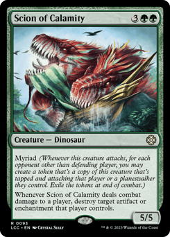 Myriad (Whenever this creature attacks, for each opponent other than defending player, you may create a token copy that's tapped and attacking that player or a planeswalker they control. Exile the tokens at end of combat.) Whenever this creature deals combat damage to a player, destroy target artifact or enchantment that player controls.