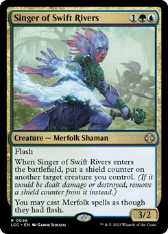 Flash When this creature enters, put a shield counter on another target creature you control. (If it would be dealt damage or destroyed, remove a shield counter from it instead.) You may cast Merfolk spells as though they had flash.
