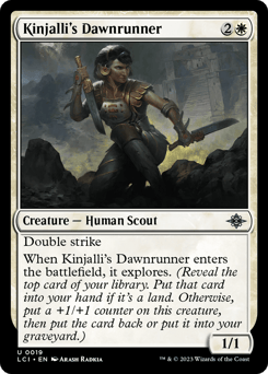 Double strike When this creature enters, it explores. (Reveal the top card of your library. Put that card into your hand if it's a land. Otherwise, put a +1/+1 counter on this creature, then put the card back or put it into your graveyard.)