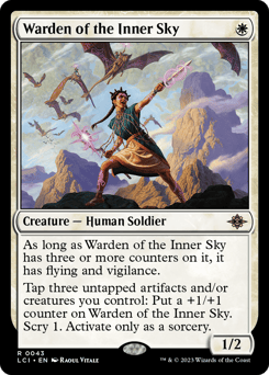 As long as this creature has three or more counters on it, it has flying and vigilance. Tap three untapped artifacts and/or creatures you control: Put a +1/+1 counter on this creature. Scry 1. Activate only as a sorcery.