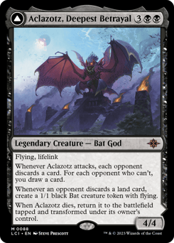 Deathtouch Whenever this creature attacks the player with the most life or tied for most life, create a 1/1 white Vampire creature token with lifelink. Whenever this creature attacks while you have the most life or are tied for most life, you draw a card and you lose 1 life.
