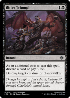 As an additional cost to cast this spell, discard a card or pay 3 life. Destroy target creature or planeswalker.