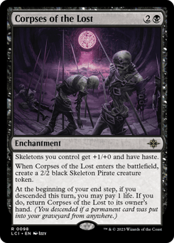 Skeletons you control get +1/+0 and have haste. When this enchantment enters, create a 2/2 black Skeleton Pirate creature token. At the beginning of your end step, if you descended this turn, you may pay 1 life. If you do, return this enchantment to its owner's hand. (You descended if a permanent card was put into your graveyard from anywhere.)