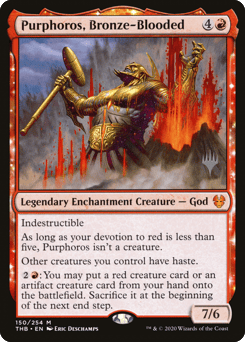 Indestructible As long as your devotion to red is less than five, Purphoros isn't a creature. Other creatures you control have haste. {2}{R}: You may put a red creature card or an artifact creature card from your hand onto the battlefield. Sacrifice it at the beginning of the next end step.
