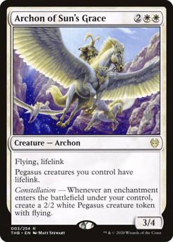 Flying Lifelink (Damage dealt by this creature also causes you to gain that much life.) Pegasus creatures you control have lifelink. Constellation — Whenever an enchantment you control enters, create a 2/2 white Pegasus creature token with flying.
