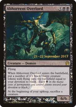 Flying When this creature enters, create a number of 1/1 black Harpy creature tokens with flying equal to your devotion to black. (Each {B} in the mana costs of permanents you control counts toward your devotion to black.) At the beginning of your upkeep, sacrifice a creature.