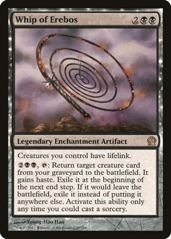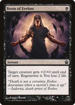 Indestructible As long as your devotion to black is less than five, Erebos isn't a creature. (Each {B} in the mana costs of permanents you control counts toward your devotion to black.) Your opponents can't gain life. {1}{B}, Pay 2 life: Draw a card.