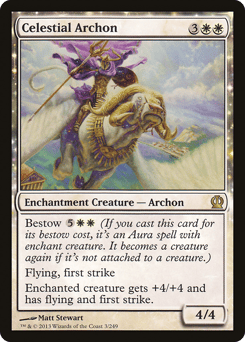 Bestow {5}{W}{W} (If you cast this card for its bestow cost, it's an Aura spell with enchant creature. It becomes a creature again if it's not attached to a creature.) Flying, first strike Enchanted creature gets +4/+4 and has flying and first strike.