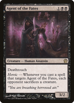 Deathtouch Heroic — Whenever you cast a spell that targets this creature, each opponent sacrifices a creature of their choice.