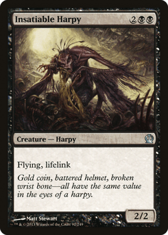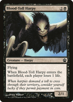 Flying When this creature enters, create a number of 1/1 black Harpy creature tokens with flying equal to your devotion to black. (Each {B} in the mana costs of permanents you control counts toward your devotion to black.) At the beginning of your upkeep, sacrifice a creature.