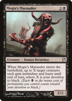 When this creature enters, up to X target creatures each gain intimidate and haste until end of turn, where X is your devotion to black. (A creature with intimidate can't be blocked except by artifact creatures and/or creatures that share a color with it. Each {B} in the mana costs of permanents you control counts toward your devotion to black.)
