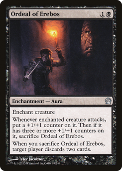 Enchant creature Whenever enchanted creature attacks, put a +1/+1 counter on it. Then if it has three or more +1/+1 counters on it, sacrifice this Aura. When you sacrifice this Aura, target player discards two cards.