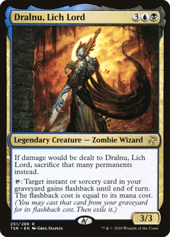 If damage would be dealt to Dralnu, sacrifice that many permanents instead. {T}: Target instant or sorcery card in your graveyard gains flashback until end of turn. The flashback cost is equal to its mana cost. (You may cast that card from your graveyard for its flashback cost. Then exile it.)