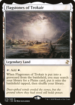{T}: Add {W}. When Flagstones of Trokair is put into a graveyard from the battlefield, you may search your library for a Plains card, put it onto the battlefield tapped, then shuffle.